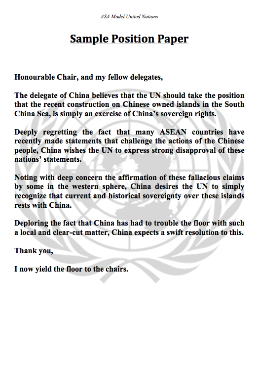 Cal high position paper format & sample basic format: Having chosen a topic, make an. Times new roman, size 12 font, single spaced for the heading, country profile, & works cited (sections i & v only). A position paper is a diplomatic statement of your country's position on the issues before your below is (1) an annotated position paper sample to help guide you in formatting (2) a sample. As you see, this position paper sample outline can be applied to pretty much any topic. A position paper can be arranged in the following format: The position papers submitted here are formal, public statements of a delegation's position on the topics under consideration in a particular. United nations security council country: You cannot just make a statement with no supporting evidence for your position and hope that such an essay will do the trick. Sample position paper, not mine. To share your opinion with the. A position paper is a common type of academic argument writing assignment. Writing position papers serves enhance the quality of preparation of the delegates and to focus their thoughts on the topic areas.